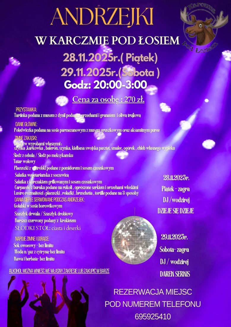Początek imprezy Andrzejkowej, godzina 20:00 do 3:00 / 28 listopada oraz 29 listopada 2025 roku.